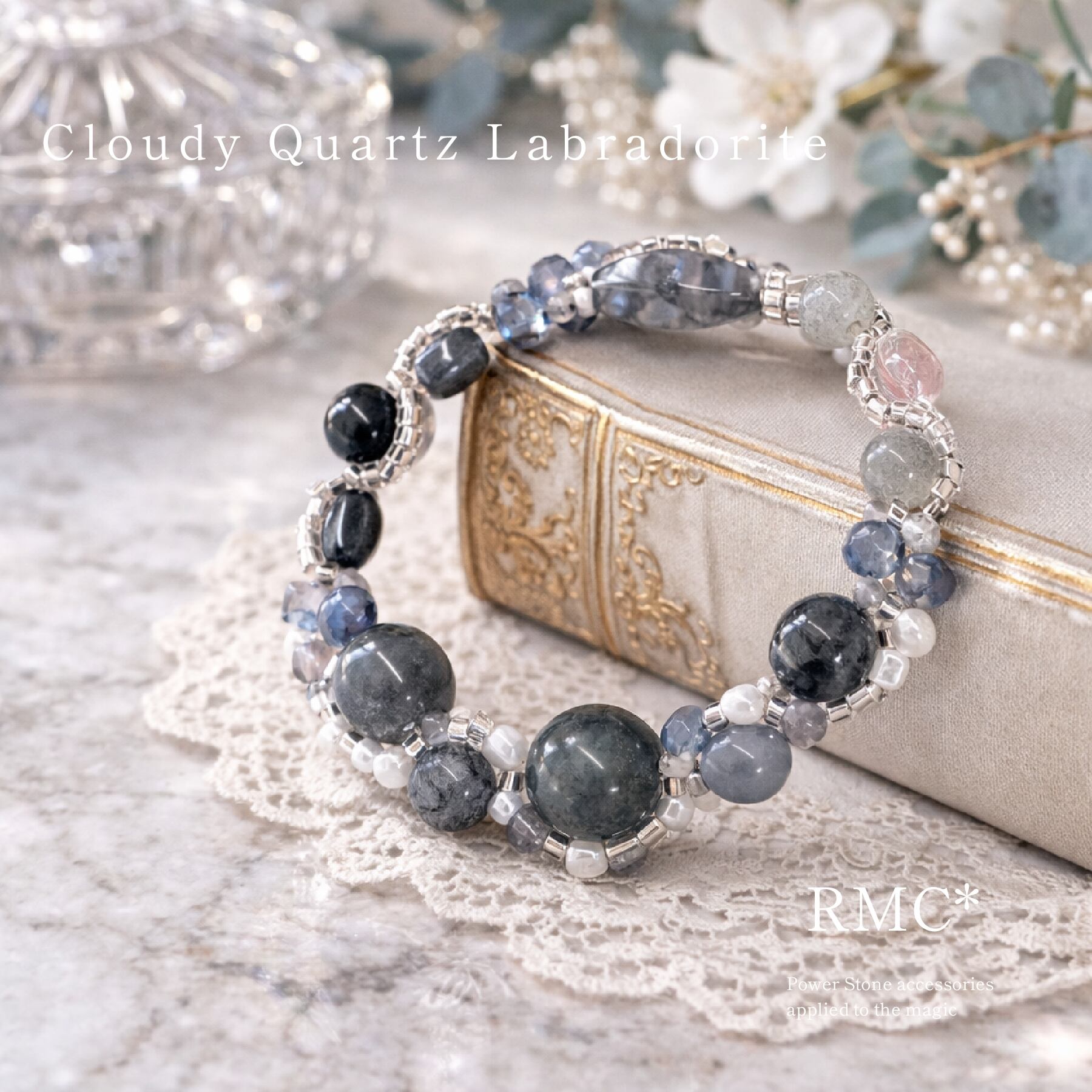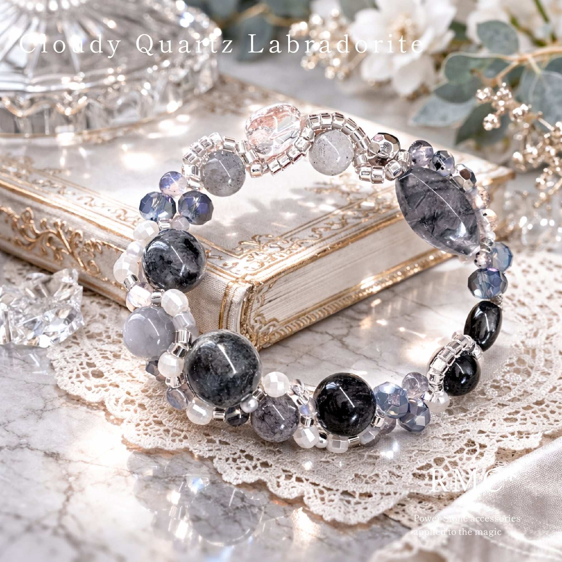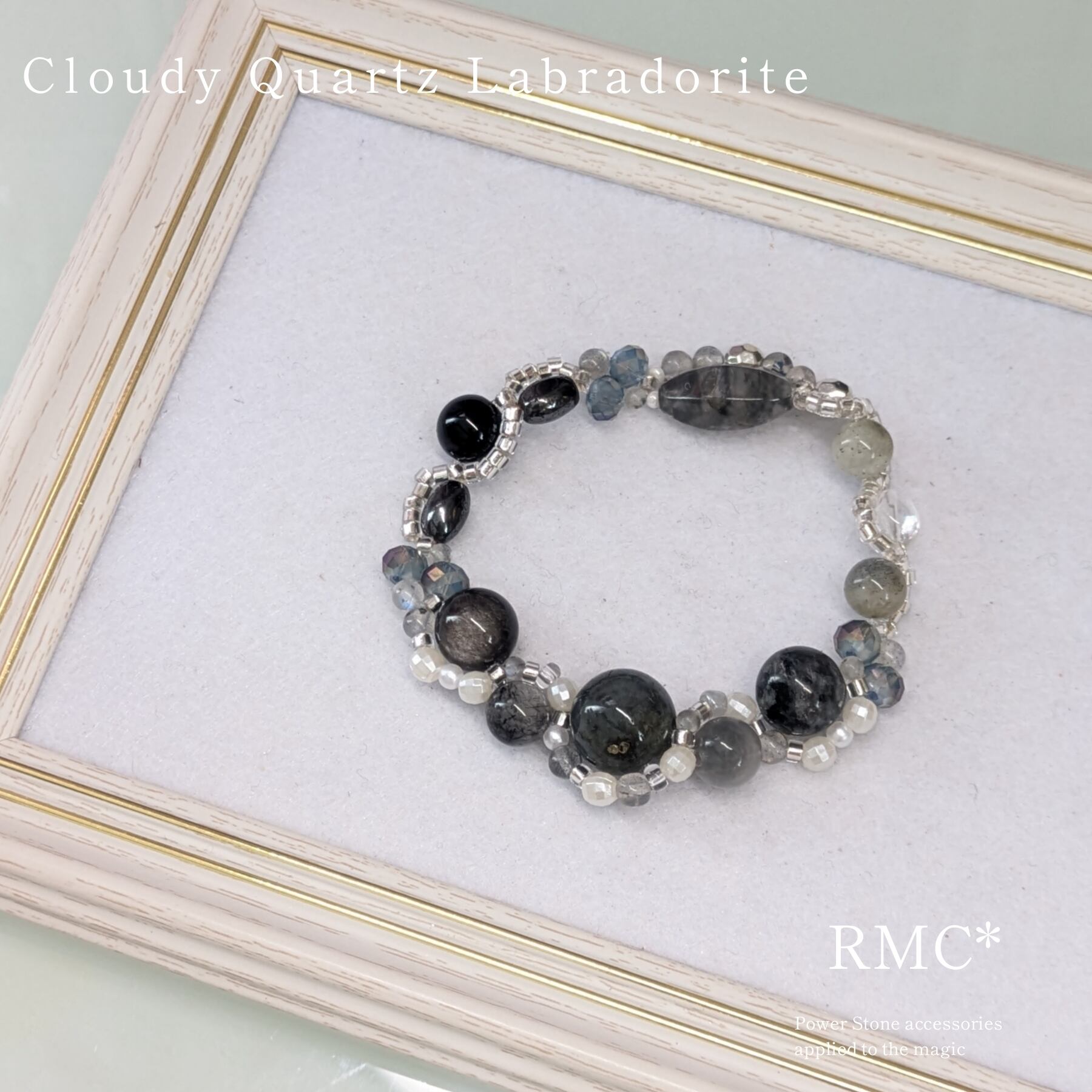 ラブラドライトとクラウディクォーツのモノクロ夜空 天然石ブレスレット