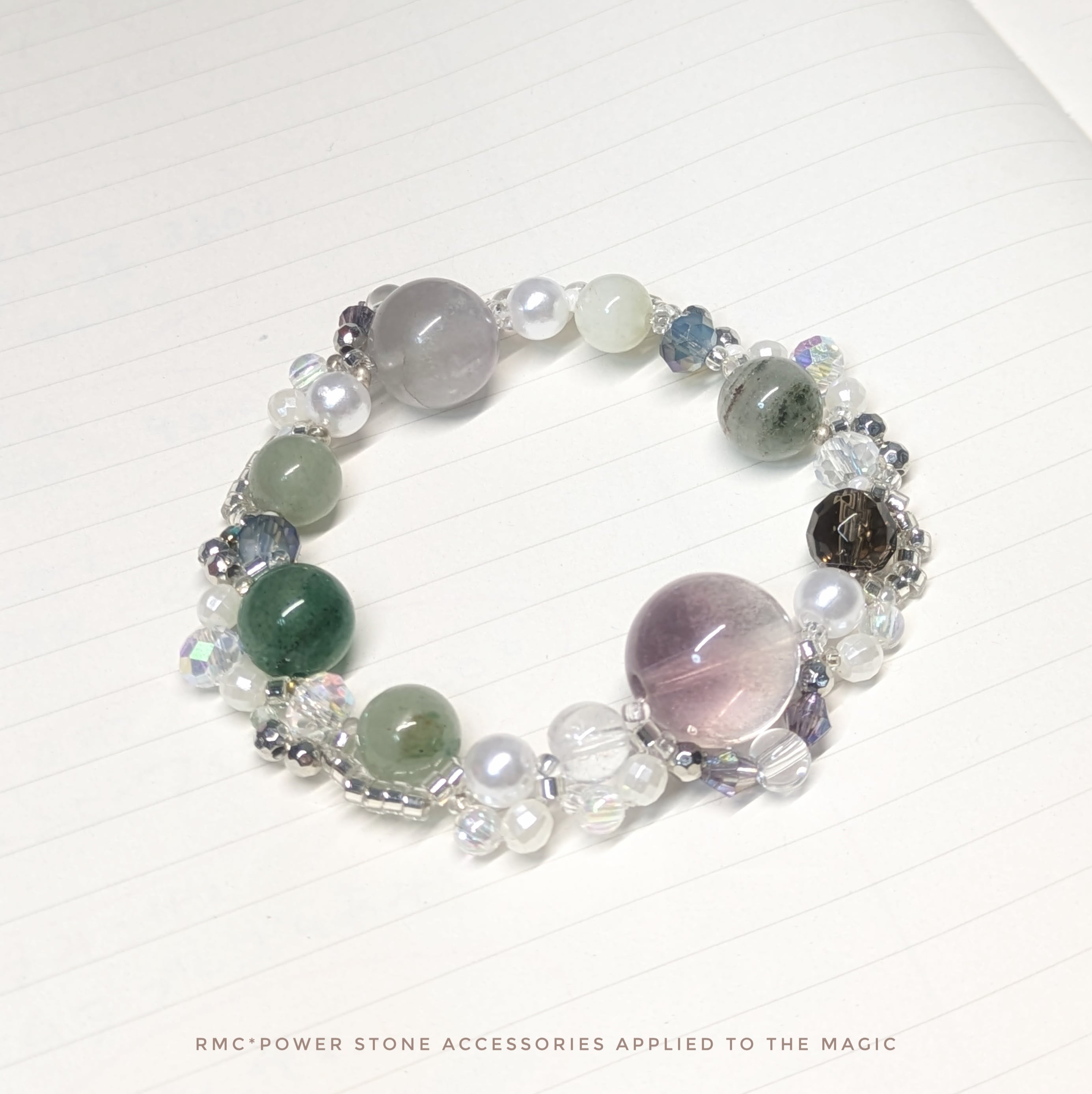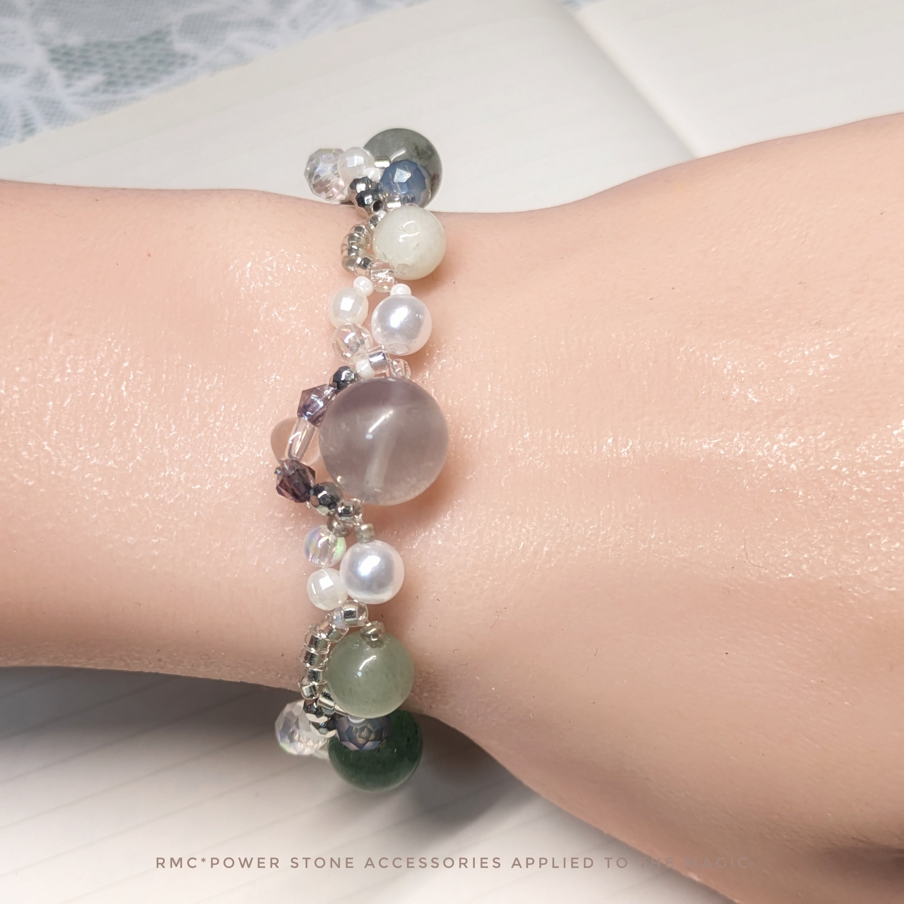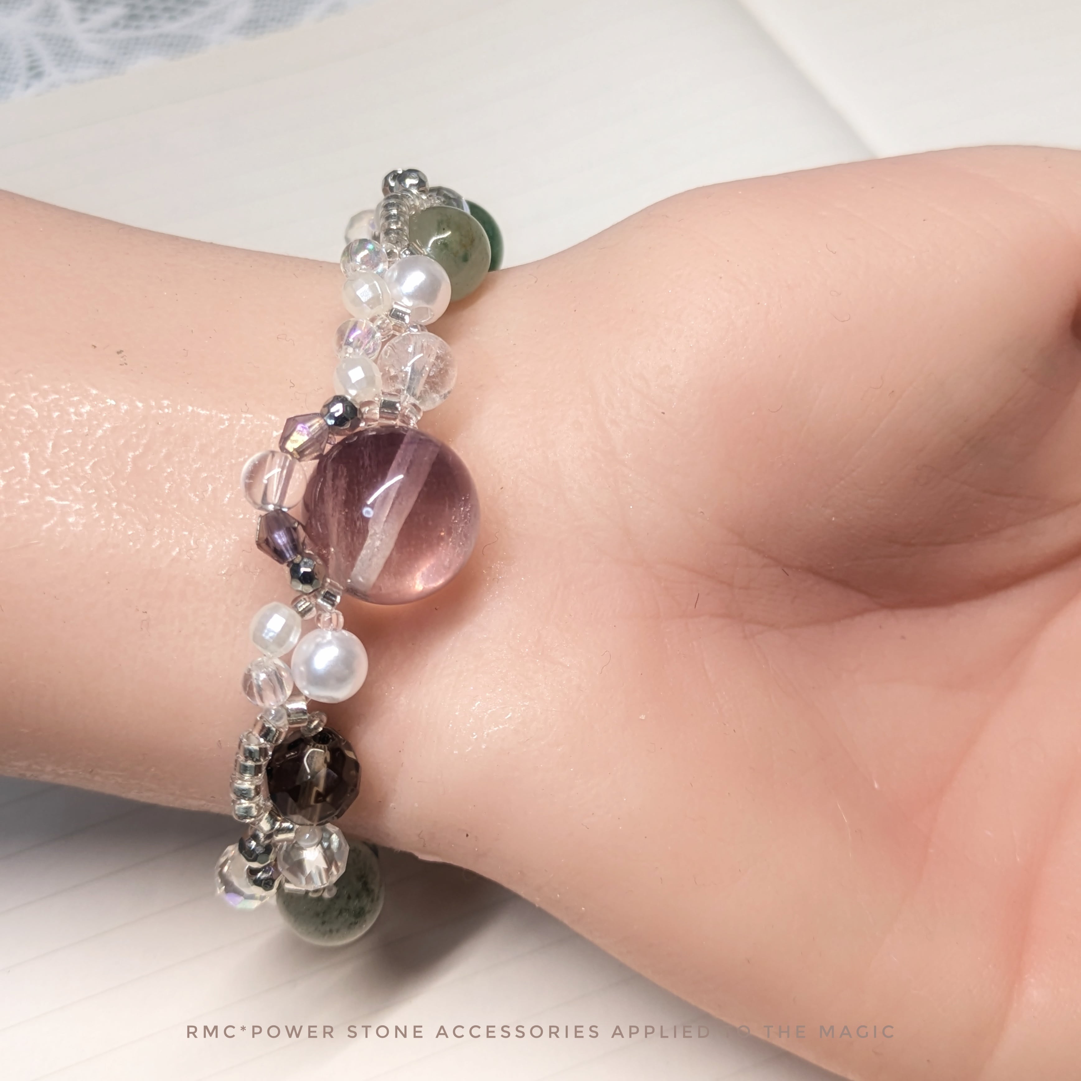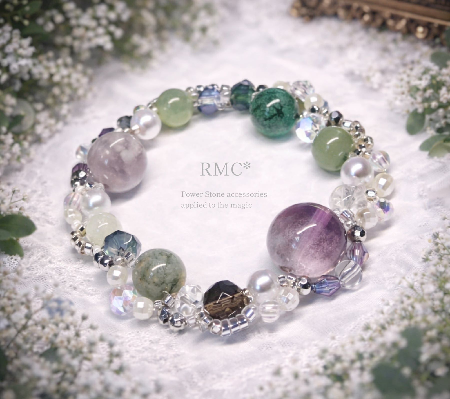 フローライトと雨の日お花畑。編みデザイン天然石ブレスレット