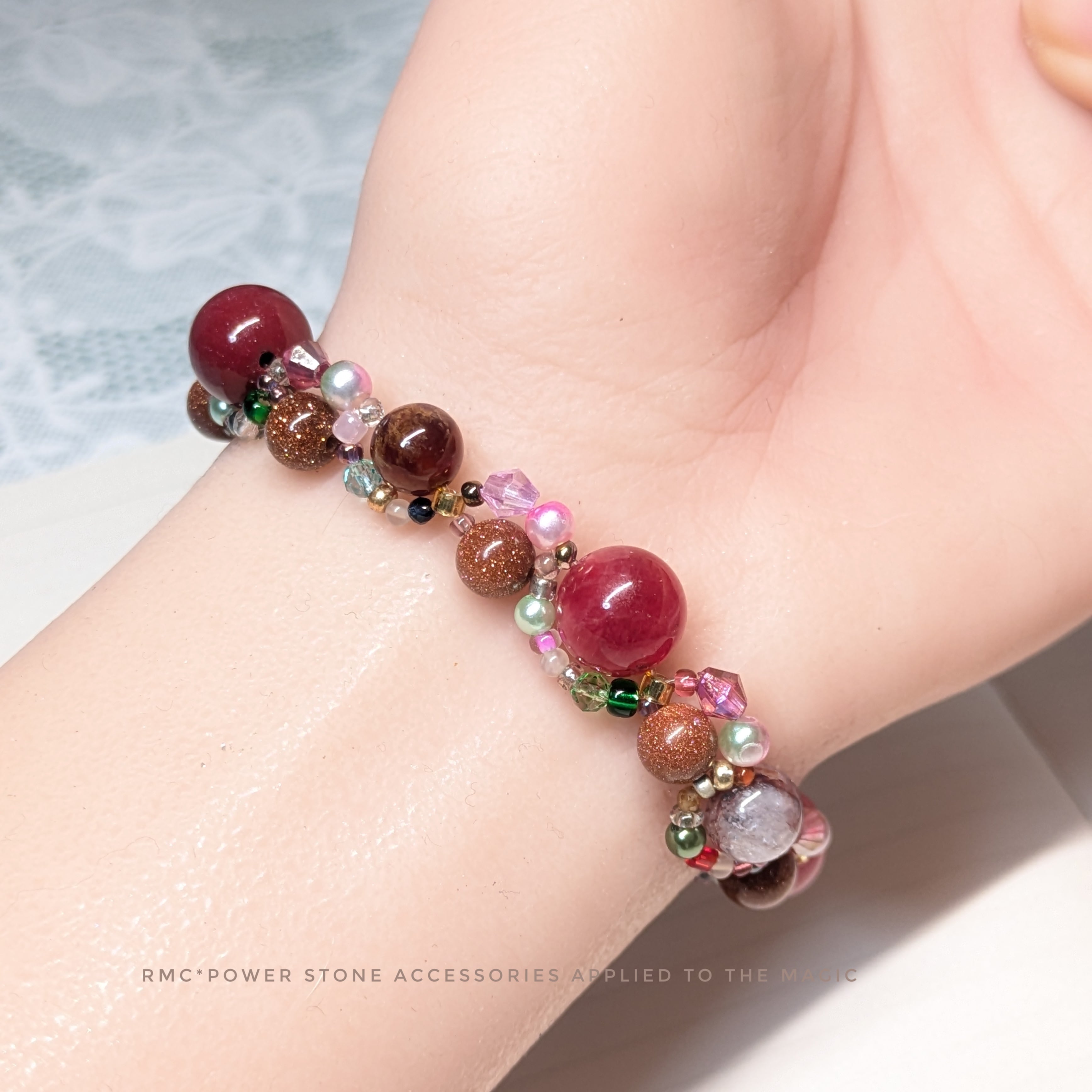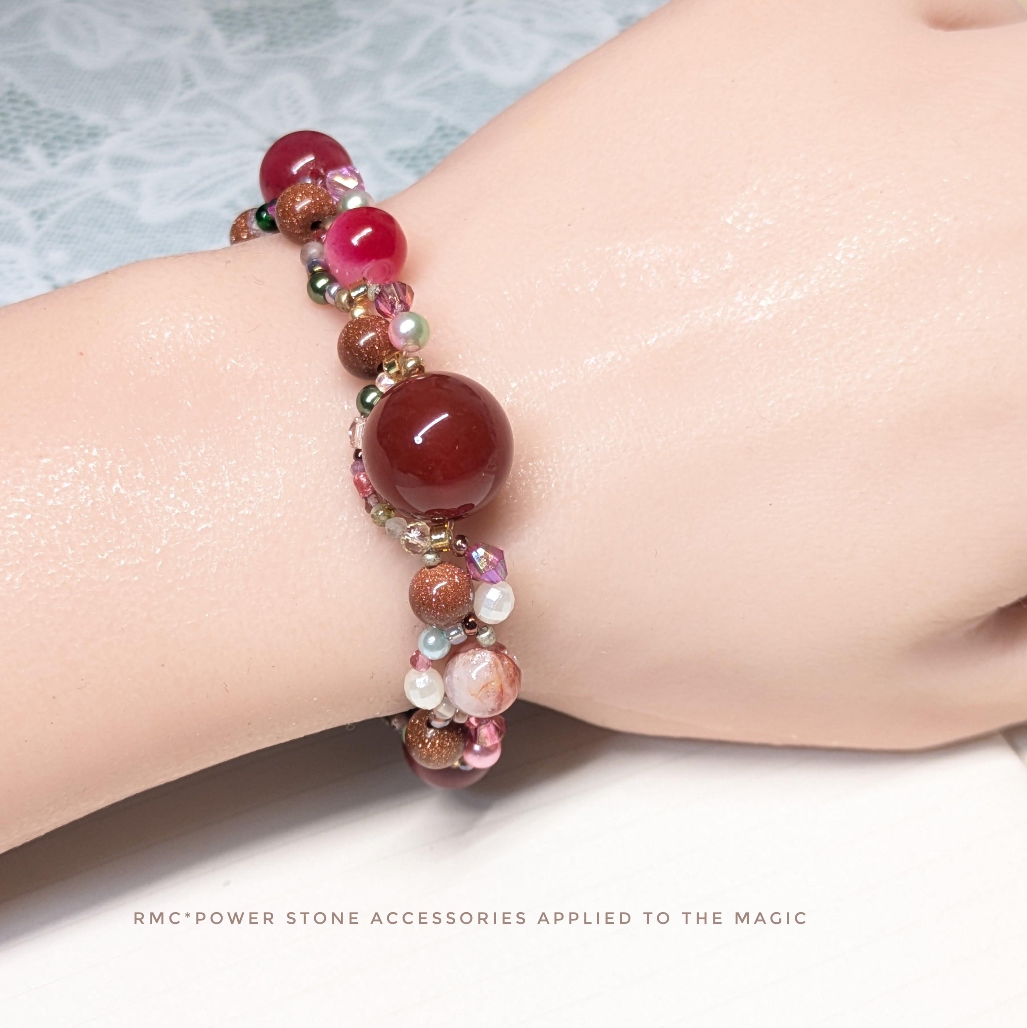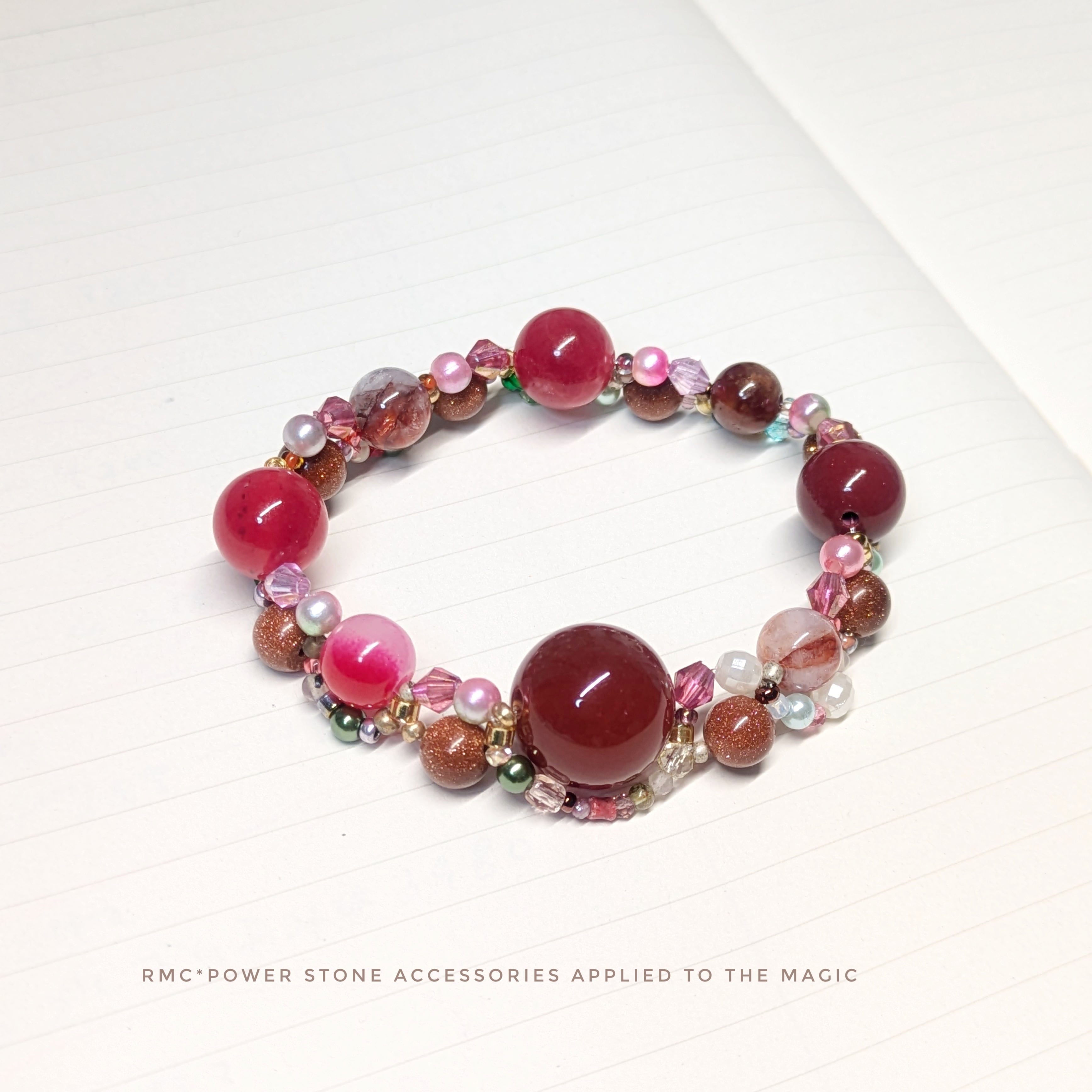 レッドアゲート赤色お花畑。編みデザイン天然石ブレスレット