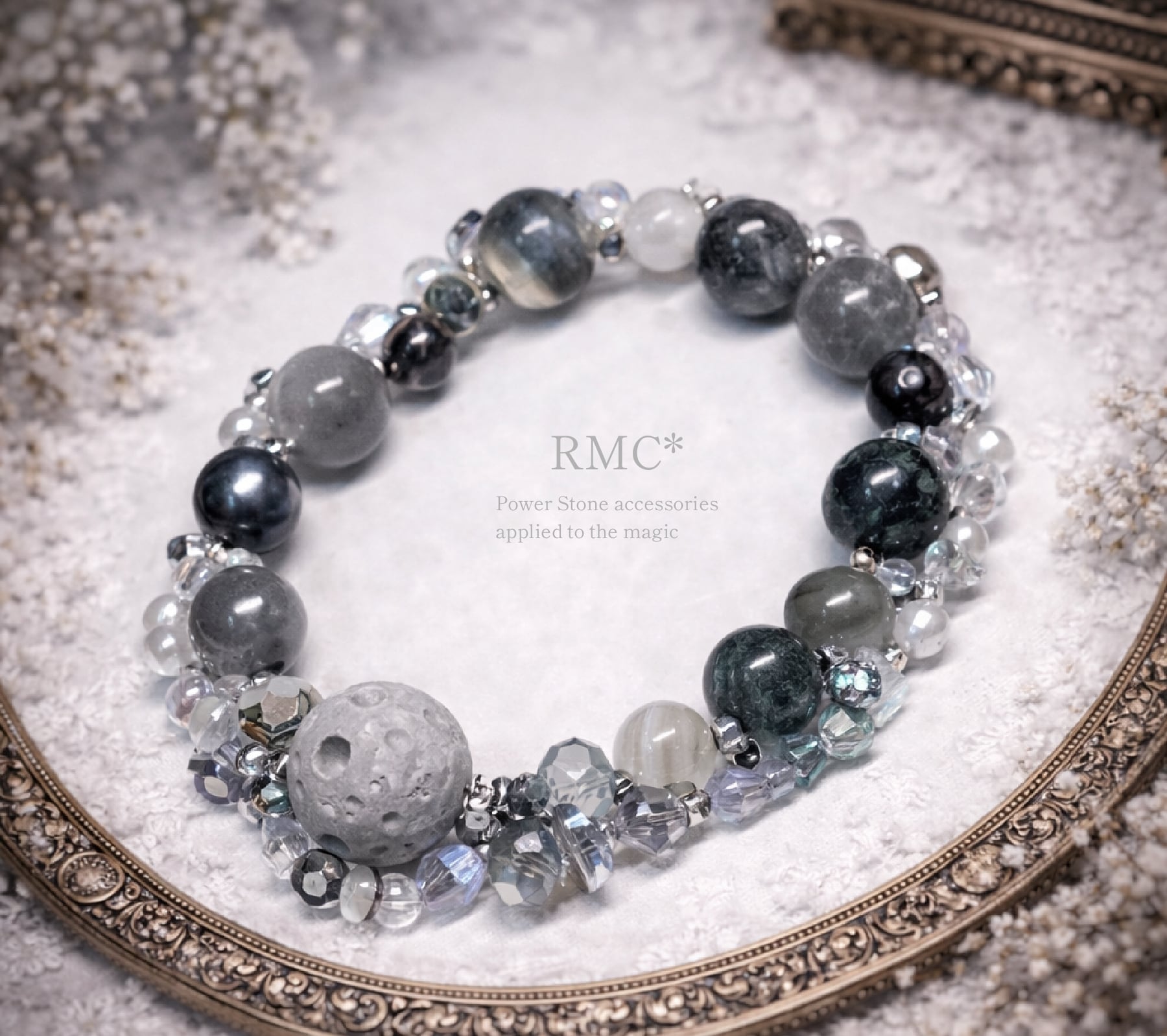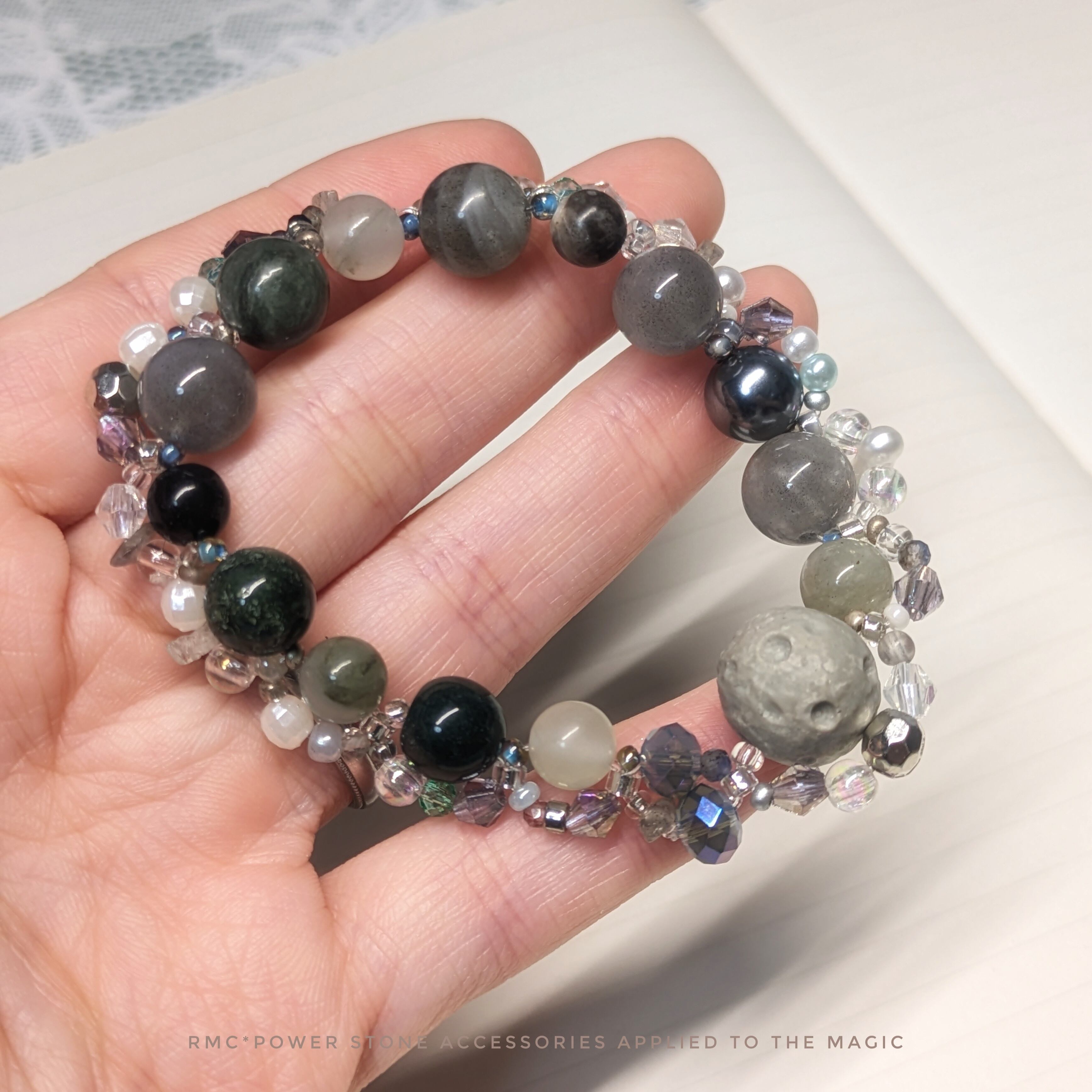 ラブラドライトと菩提樹のお月様。編みデザイン天然石ブレスレット