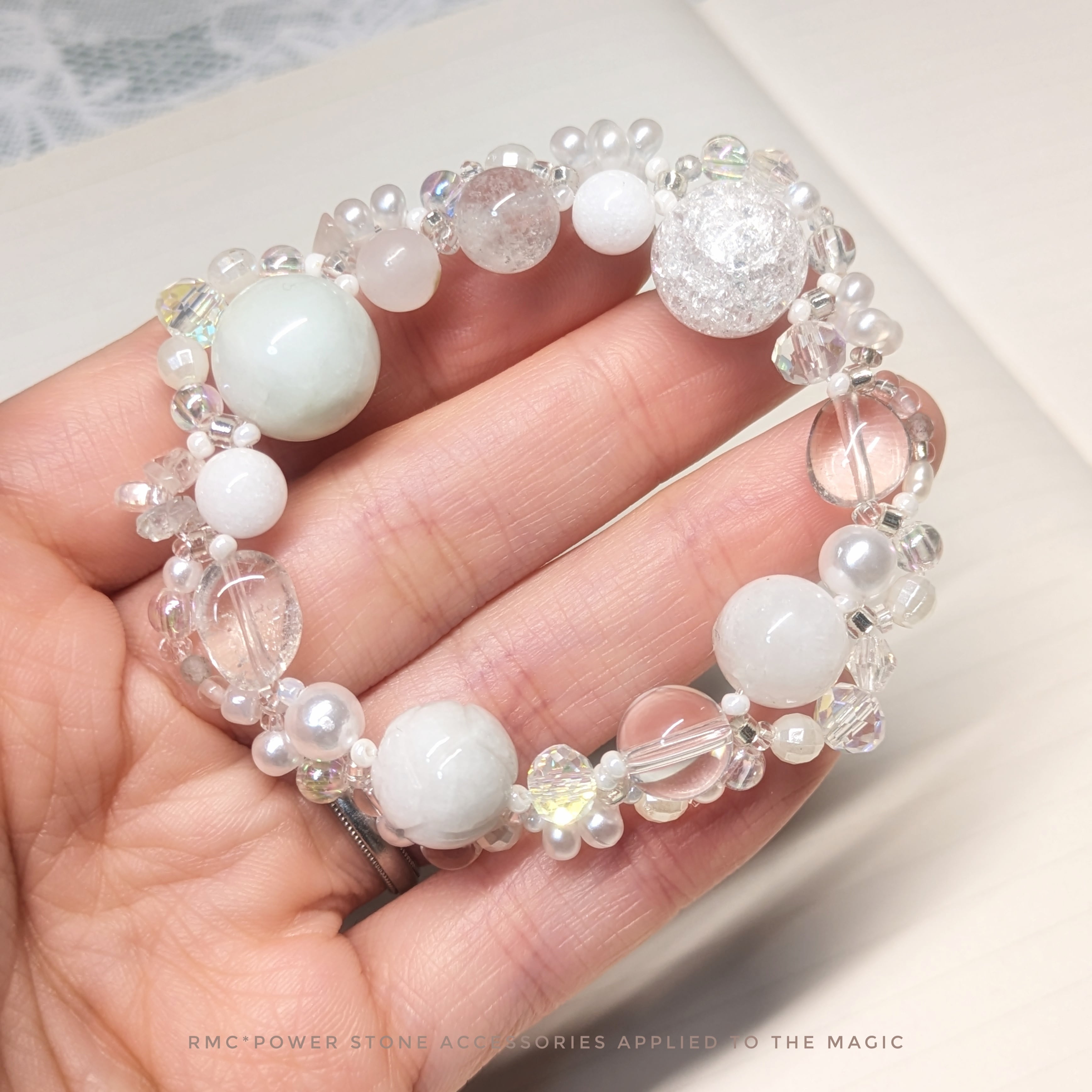 翡翠の蓮の花と白い世界。編みデザイン天然石ブレスレット