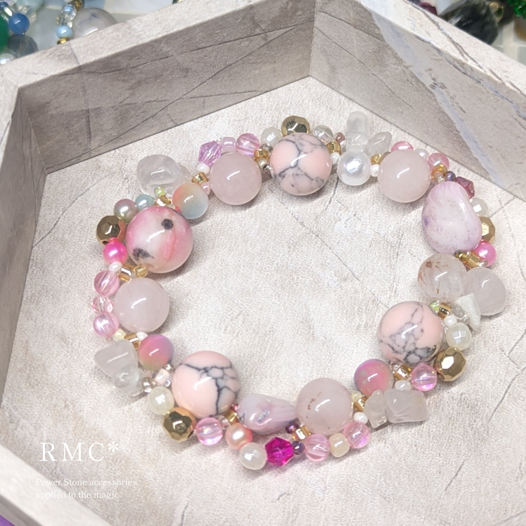 ピンクのハウライトのキュートデザイン 編みデザイン天然石ブレスレット