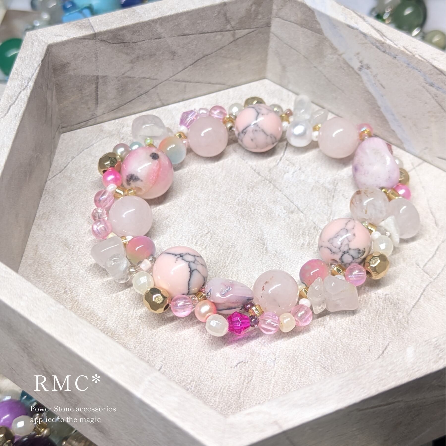 このピンクのハウライトのキュートデザイン 編みデザイン天然石ブレスレットは、愛らしいピンクの色合いが特徴で、まるで甘く可愛らしい花のような魅力を醸し出します。ハウライトは、穏やかな心をもたらし、ストレスを軽減する効果が期待されています。お写真は15〜16cmの作品ですが、最大18.5cmまでサイズ調整が可能ですので、お好みに合わせてお使いいただけます。